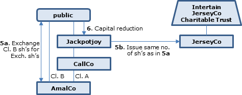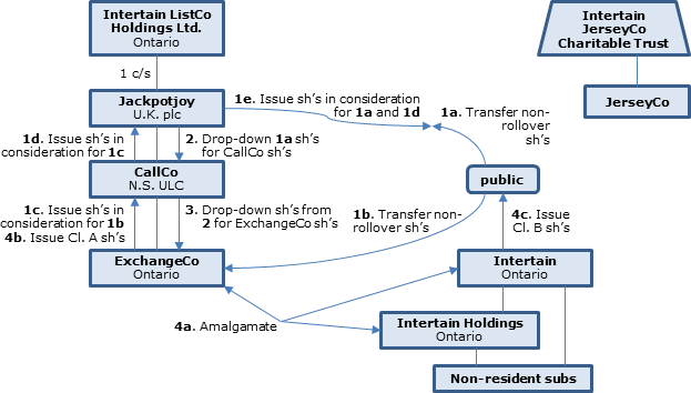Intertain, which is an OBCA holding company listed on the TSX, holds most of its assets in non-resident subsidiaries and generates substantially all of its (on-line gaming) revenues in Europe through such subsidiaries. In order to effectively move its residence to the U.K., it has caused the formation of a U.K. plc (“Jackpotjoy”) which (except for those Canadian shareholders who have elected for rollover treatment) will issue its shares to the Intertain shareholders under an OBCA Plan of Arrangement in consideration for the transferring all but one of their shares to a grandchild Canadian subsidiary of Jackpotjoy (“ExchangeCo”) and for transferring the remaining common share to Jackpotjoy, for contribution down the chain to ExchangeCo. Those electing for rollover treatment instead will have their Intertain shares exchanged for Class B shares of the amalgamated corporation resulting from the amalgamation of ExchangeCo and Intertain (“AmalCo”), and then exchange those Class B shares under a s. 86 reorg for exchangeable shares. On the issuance of these exchangeable shares, Jackpotjoy will issue a corresponding number of shares to a Jersey company owned by a charitable trust, with the voting rights on those shares thereafter exercised as directed collectively by the exchangeable shareholders. When an exchangeable shareholder retracts (or AmalCo gives notice of redemption), the immediate parent of AmalCo (“CallCo”) will exercise its overriding call right, so that the exchangeable shareholder will transfer its exchangeable shares to CallCo, CallCo will issue shares to Jackpotjoy and in consideration therefor Jackpotjoy will direct the Jersey company to deliver the relevant number of Jackpotjoy Shares to the former exchangeable shareholder. The exchangeable shares are slated to mature no later than the 5th anniversary of their issuance and, in the meantime, are expected to be listed on the TSX.
