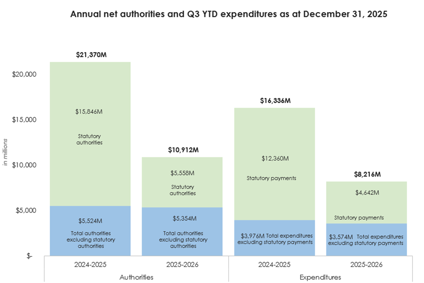 The YTD third quarter expenditures as at December 31, 2025 have decreased by $8,120M ($8.1B), from $16,336M ($16.3B) in 2024-2025 to $8,216M ($8.2B) in 2025-2026, as displayed in the Statement of Authorities. The material components of this YOY change are explained below by vote and standard object.