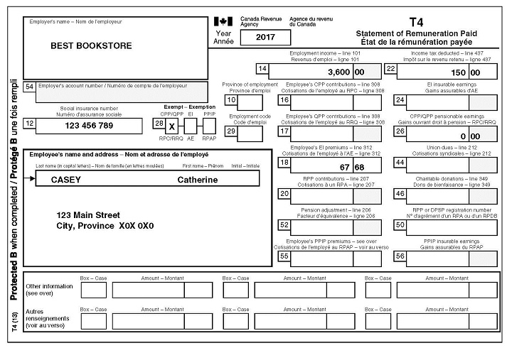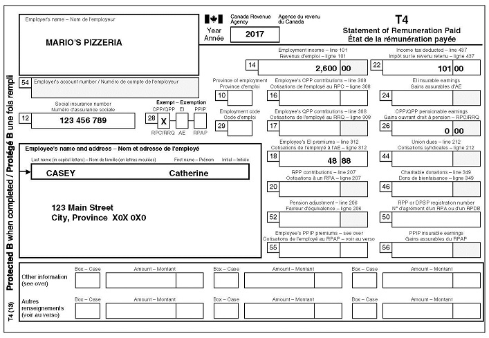 - Employee’s name and address: Casey, Catherine, 123 Main Street, City, Province, X0X 0X0