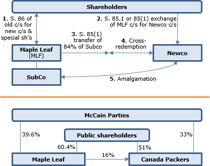 Maple Leaf Foods (or MLF) is proposing to effect a butterfly spin-off, pursuant to a CBCA Plan of Arrangement, of 84% of the shares of the subsidiary (Subco) containing its pork operation assets to a new corporation, named Canada Packers Inc., to be held by its shareholders (with the remaining 16% of Canada Packers being held by MLF). The mechanics of the butterfly essentially entail a targeted s. 86 exchange by the MLF shareholders of their “old” MLF common shares for “new” common shares (quite similar to the old common shares) and special shares, the transfer of those special shares under s. 85.1 to a Newco for Newco common shares, the transfer by MLF of 84% of its shareholding in Subco to Newco for Newco preferred shares, the redemption of the cross-shareholdings and the amalgamation of Newco and Subco to form Canada Packers. Implementation is conditional on receipt of a CRA ruling letter and on the common shares of the Newco being conditionally listed on the TSX.